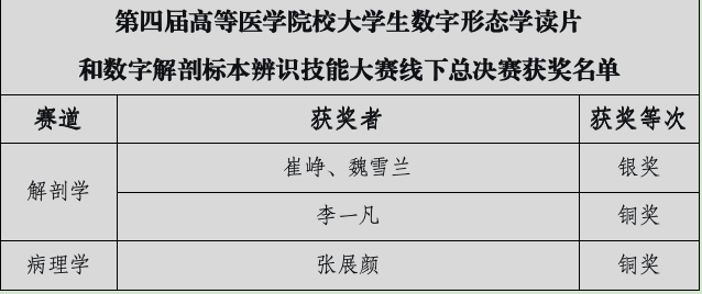 在第四届高等医学院校大学生数字形态学读片和数字解剖标本辨识技能大赛中,我校学子凭借扎实的专业基础和出色的临场发挥,在线上决赛中,共斩获一等奖8项、二等奖15项、三等奖15项,学校荣获“优秀组织奖”,其中4名学生跻身决赛前1%;在线下总决赛中勇夺2银2铜,并助力学校荣获团体季军。