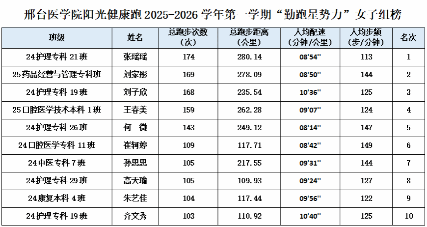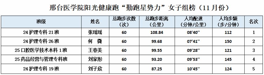 2024级护理专科21班张瑶瑶同学是本学期女子组第一名,她表示,跑步中难免会有疲惫和想放弃的时候,但每次想到自己的目标,想到同学们都在努力,就会咬牙坚持,坚持是这次获奖的关键。