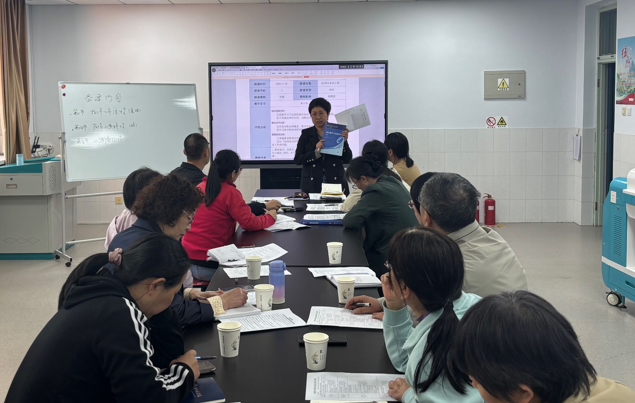 赛中,两个团队围绕本科教学重点内容,按照“课程初步设计介绍—团队研讨与优化—方案完善与总结”流程,完整呈现45分钟备课过程。微生物与免疫学团队侧重教学重难点拆解与知识点逻辑梳理,生物化学团队侧重教学设计优化与课堂互动环节设计,两支团队重点突出、思路清晰,充分展现了良好的专业素养与团队教研水平。在团队研讨环节,教师们围绕教学难点各抒己见,在观点碰撞中集思广益,研讨氛围浓厚且富有实效。