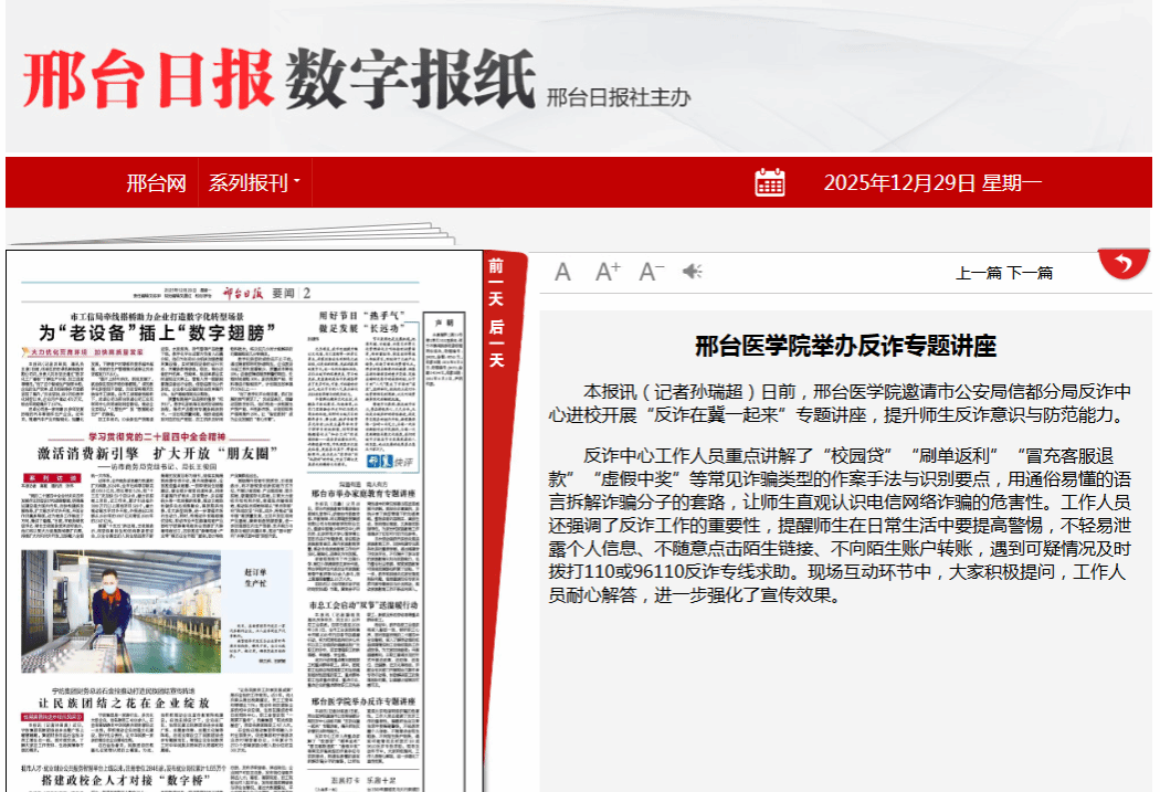 日前,邢台医学院邀请市公安局信都分局反诈中心进校开展“反诈在冀一起来”专题讲座,提升师生反诈意识与防范能力。